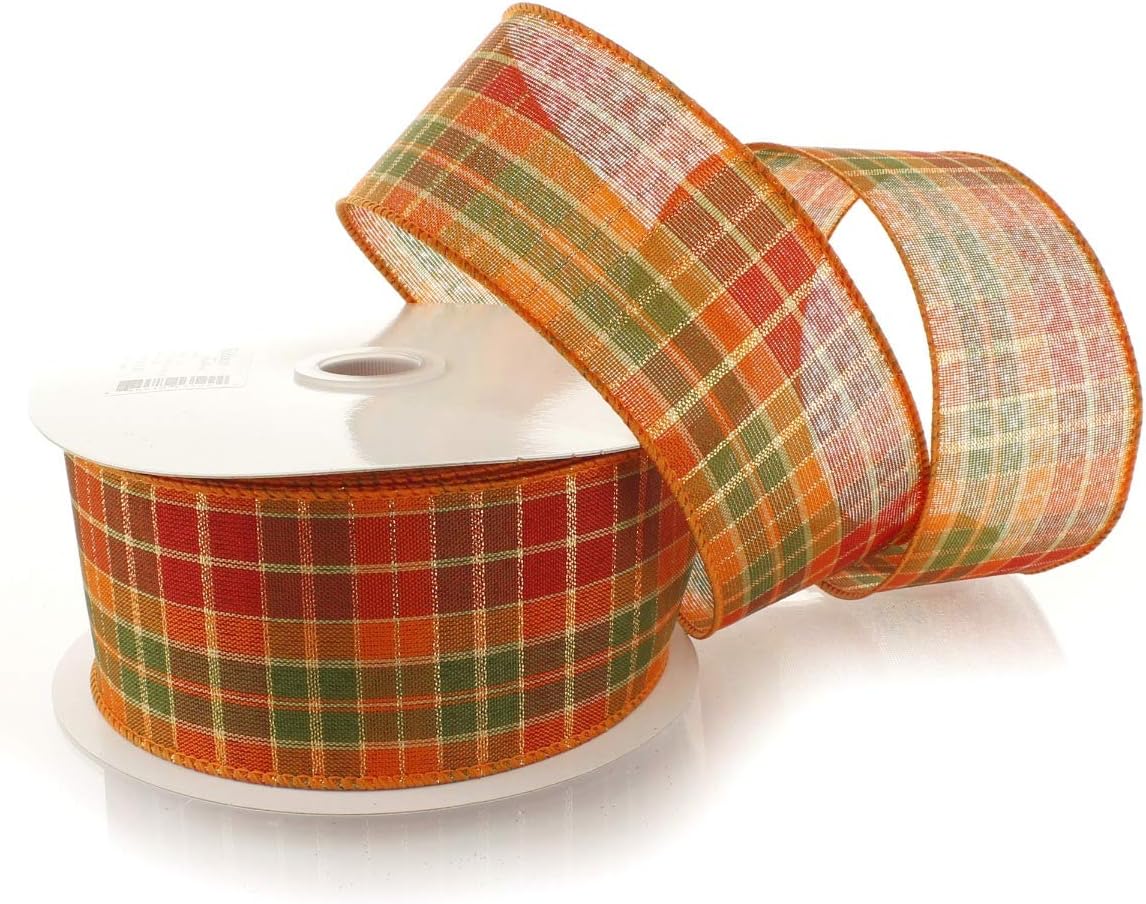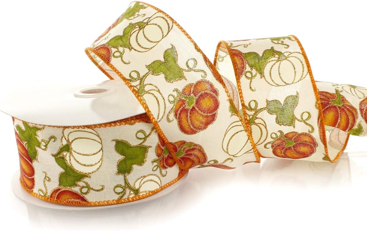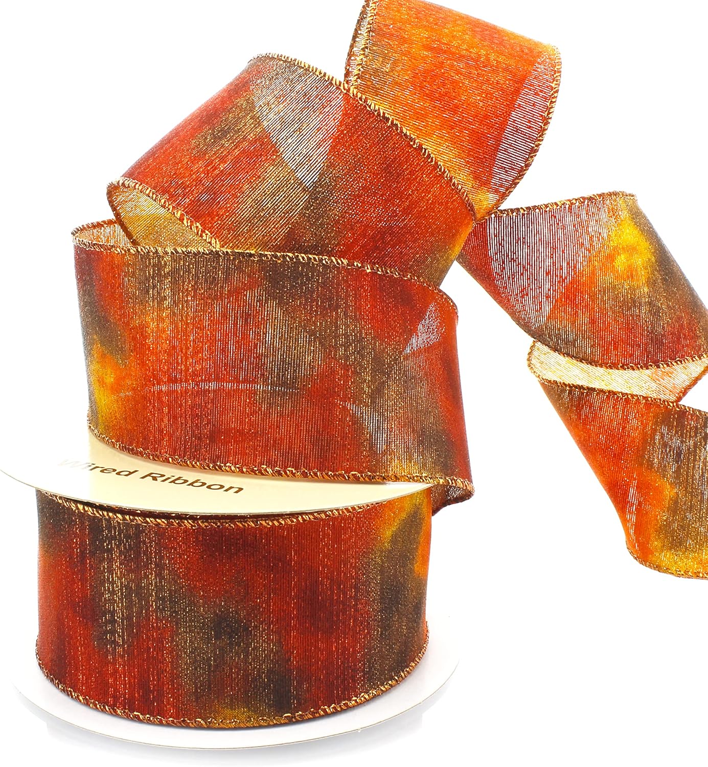 Wired Burlap Ribbon | Fall Leaves Get creative with our 2.5" wired craft ribbon!Constructed of a natural faux burlap ribbon base with a deep gold metallic edging and and glitter accented fall leaves print design in shades of orange, green, crimson, and gold. This ribbon would make a beautiful addition to packaging gifts, floral arrangements, and fall decor such as adding to garlands, wreaths, etc.Wired ribbons have a thin monofilament wire along the edges of the ribbon that help the ribbon to be shaped into beautiful loops and bows and hold their desired shape.60% polyester, 40% cotton*25yd reels may be spliced