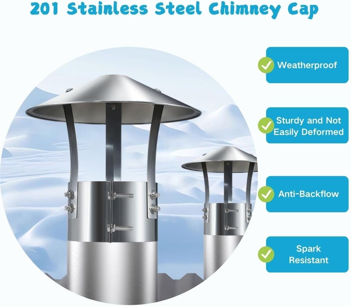 Stainless steel chimney caps are sturdy protective barriers tailored for your chimneys; Made from thickened stainless steel, they offer crack resistance, remaining sturdy even under prolonged outdoor exposure to rain and temperature fluctuationsName: Weatherproof Chimney CapSize: 75mm to 315mm, various sizes available to meet different needsMaterial: Thickened 201 stainless steel, robust construction providing a solid foundation for protectionColor: SilverShape: Conical, designed to fit smoke extraction requirementsAccessories: Includes 1 chimney cap, mounting screws, and installation glovesApplications: Widely compatible with household kitchen stoves, villa fireplaces, small factory flues, restaurant exhaust systems, and roof vents. Whether for residential or commercial use, its superior performance provides comprehensive protection for your chimney systemPrecautions: Wear gloves before installation to prevent hand injuries