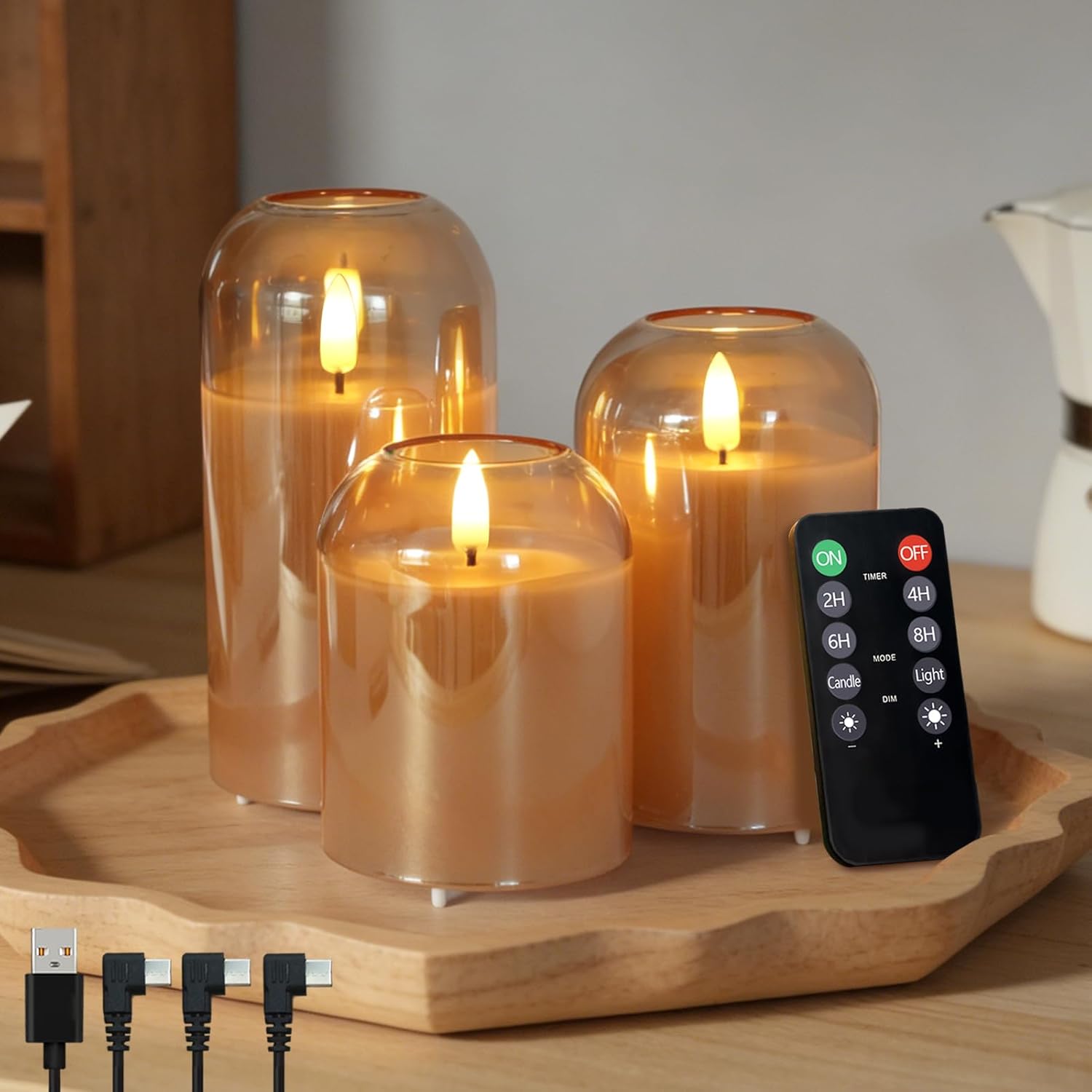 LED Candle Light Set with Remote Control - Real Wax Interior[Features:]1. Real Wax Interior: Offers an authentic candle appearance and texture. 2. Pumpkin-Shaped Mouth Design: Adds a festive touch, perfect for Halloween decorations. 3. Remote Control Operation: Easily manage on/off, brightness adjustment, and timer settings (2/4/6/8 hours). 4. Dual Mode Selection: Mimics candlelight flicker mode and steady light mode. 5. USB Rechargeable: Convenient and environmentally friendly. 6. Safe and Flameless: Smoke-free and fire-risk free, suitable for bathrooms, bedrooms, and more. 7. Versatile Decoration: Good for home decor, festive decorations, and gift-giving.[Instructions for Use:]Charge the candle light via USB cable; the indicator light is red while charging and turns off when fully charged. Use the remote control to select the desired mode and brightness. Set the timer to automatically turn off the candle light after the desired duration. Adjust the position of the candle light as needed to ensure clear remote signal reception.[Specifications:]- Material: Real wax interior, gold glass body. - Power Source: USB rechargeable, built-in 450mAh lithium-ion battery. - Charging Time: Approximately 0.9-1.5 hours. - Discharge Time: Up to 25-100 hours in flicker mode. - Remote Control Distance: Approximately 5-10 meters. - Package Contents: Candle light x3, remote control x1, USB charging cable x1, instruction manual x1.[Notes:]- Keep away from flammable materials. - Avoid using the candle light in rain or water. - If the candle light or remote control malfunctions, contact us. - Keep the candle light out of reach of children and pets.