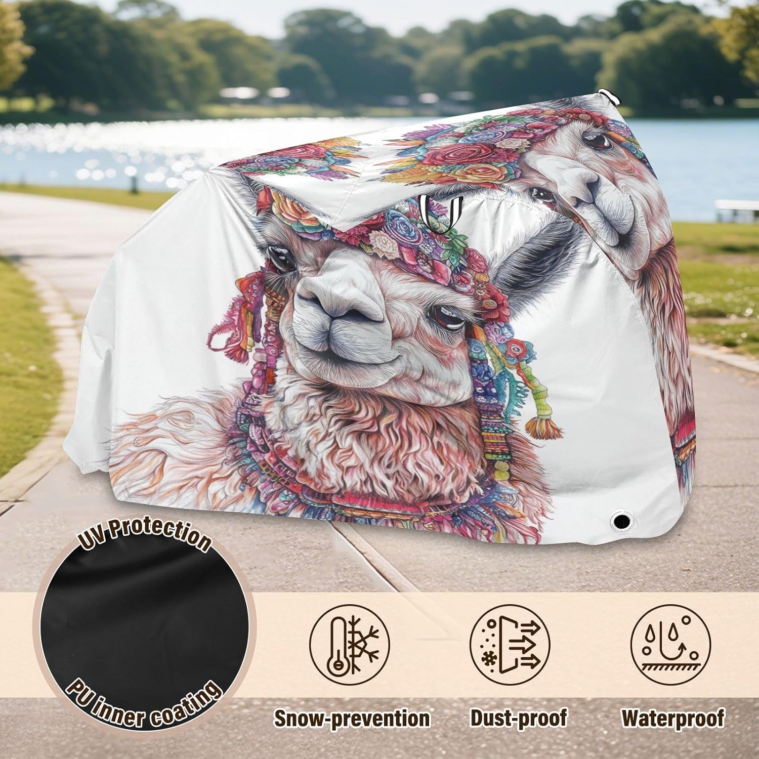 Protect your bicycle in style with our premium bike tarp, engineered for maximum defense against harsh elements. Unlike basic covers, we use specially engineered umbrella waterproof fabric - the same advanced material used in high-end rain umbrellas - delivering superior performance with unique visual appeal. Sun & Heat Defense Our fabric creates a physical cooling barrier that actively lowers your bike's temperature by: Blocking 95%+ harmful UV rays to prevent paint fading Providing exceptional shading & heat insulation (up to 20℉/11℃ reduction vs direct sun) Offering SPF 50+ equivalent protection for sensitive components Rain & Dust Protection Water-repellent coating causes rain to bead and roll off Tightly woven fabric acts as dustproof barrier for long-term storage Prevents moisture buildup with breathable side panels (prevents condensation) User-Focused Design LOCK ACCESS HOLE at front wheel enables secure locking without removing cover ADJUSTABLE BUCKLE STRAP at rear wheel anchors cover during strong winds Reflective safety strips on handles enhance nighttime visibility Ultra-lightweight (23 oz) folds into included pouch Unbeatable Aesthetics Choose from over 1,000 designer patterns - from sleek geometrics to vibrant nature motifs - transforming your bike into a street-style statement while competitors offer only solid colors.