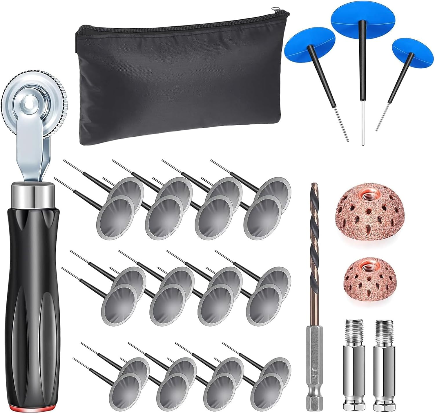 All In Single 29 Piece Vehicle Tire Maintenance Set With Compact Storage For Recovery Demands Features: Fixing the issue of traditional tools shattering easily and extending their existence Addressing issue of large repair tools and making it ideal for road excursions and long propels Providing a finish answer for tire concerns for both home users and specialists Fixing the inefficiency of traditional methods Making it suitable for greenhorn chauffeurs and female car proprietors Specifications: Substancemail: Metal, permanent and capable endure powerful use Processecond: Accuracy machining ensures the accuracy and reliability each tool Sizemail: Each tool is developed in ergonomics and is simple carry and operate Selling characteristicsecond: 29 piece set, providing comprehensive tire repair repairs Practicality: That is suitable for tire repairs in various automobiles such as automobiles, motorcycles, and, to meet daily and crisis repair demands Package Includes: 1 x 6mm tire roller 1 x 38mm tire cushioning wheel 1 4mm twist drill bit 1 black storage bag 8 34mm tire plugs 8 40mm tire plugs 8 50mm tire plugs Note: Please allow 1-2cm errors due to manual measurement Please allow for slight color differences due to different display resolution