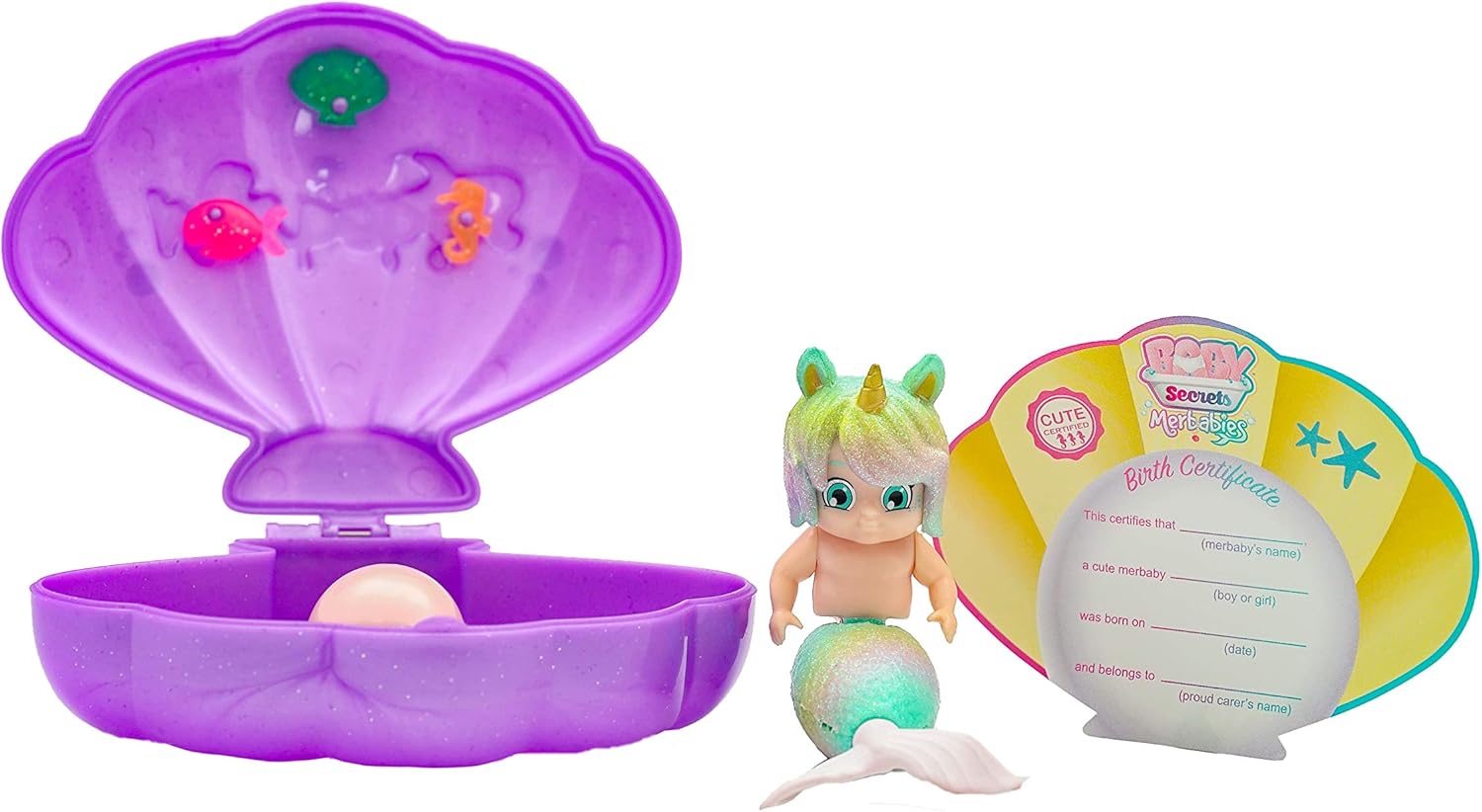 Baby Secrets babies: is it a Boy or is it a girl? Dip your Merbaby and their tail will change color to pink or blue! Once you've discovered your merbaby's gender, write their name on the birth Certificate! Now it's time to teach your Merbaby to swim - simply twist their tail, dip them in water and off they go! 12 new babies to collect in series 2. Look out for the limited edition sparkle Unicorn merbaby!baby secrets merbabies include: 1 x Merbaby, 1 x sea-crest Pearl with accessories, 1 x clam shell, 1 x birth Certificate, 1 x collector's guide