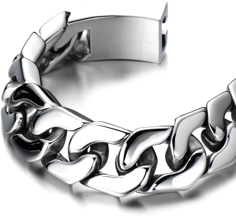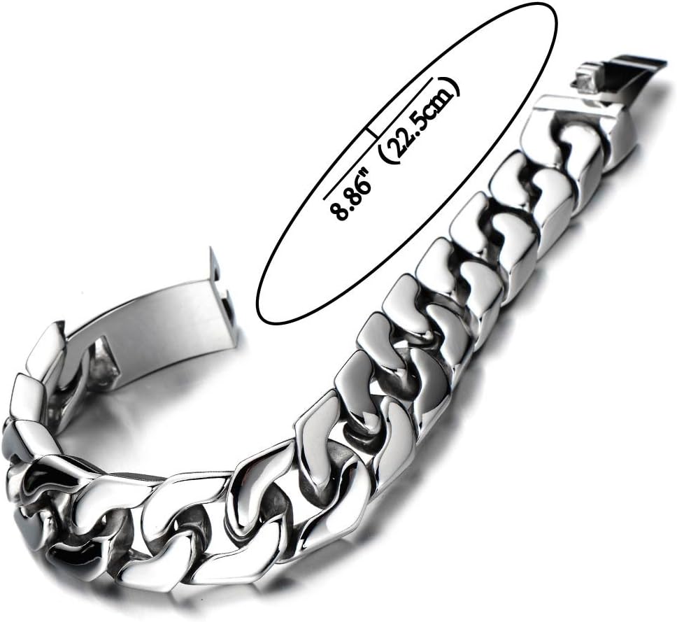 *Color: Silver*Condition: 100% brand new *Metal: Stainless Steel *Color: Silver *Finishing: High Polished *Clasp: Spring Box Clasp (please push all the way inside to lock) *Dimension: 17MM (0.66") wide x 22.5CM (8.86") long x 6MM (0.23") thick; *Weight: 112.4g * Package: Jewelry Box with Brand Name COOLSTEELANDBEYOND *Color: Black*Condition:100% brand new *Code:MB-934 *Metal:Stainless Steel *Finishing:Satin *Dimension:22CM(8.66")long; Chain Width:1.7CM(0.67") *Weight:116.4g *Package:Jewelry Box with Brand Name COOLSTEELANDBEYOND