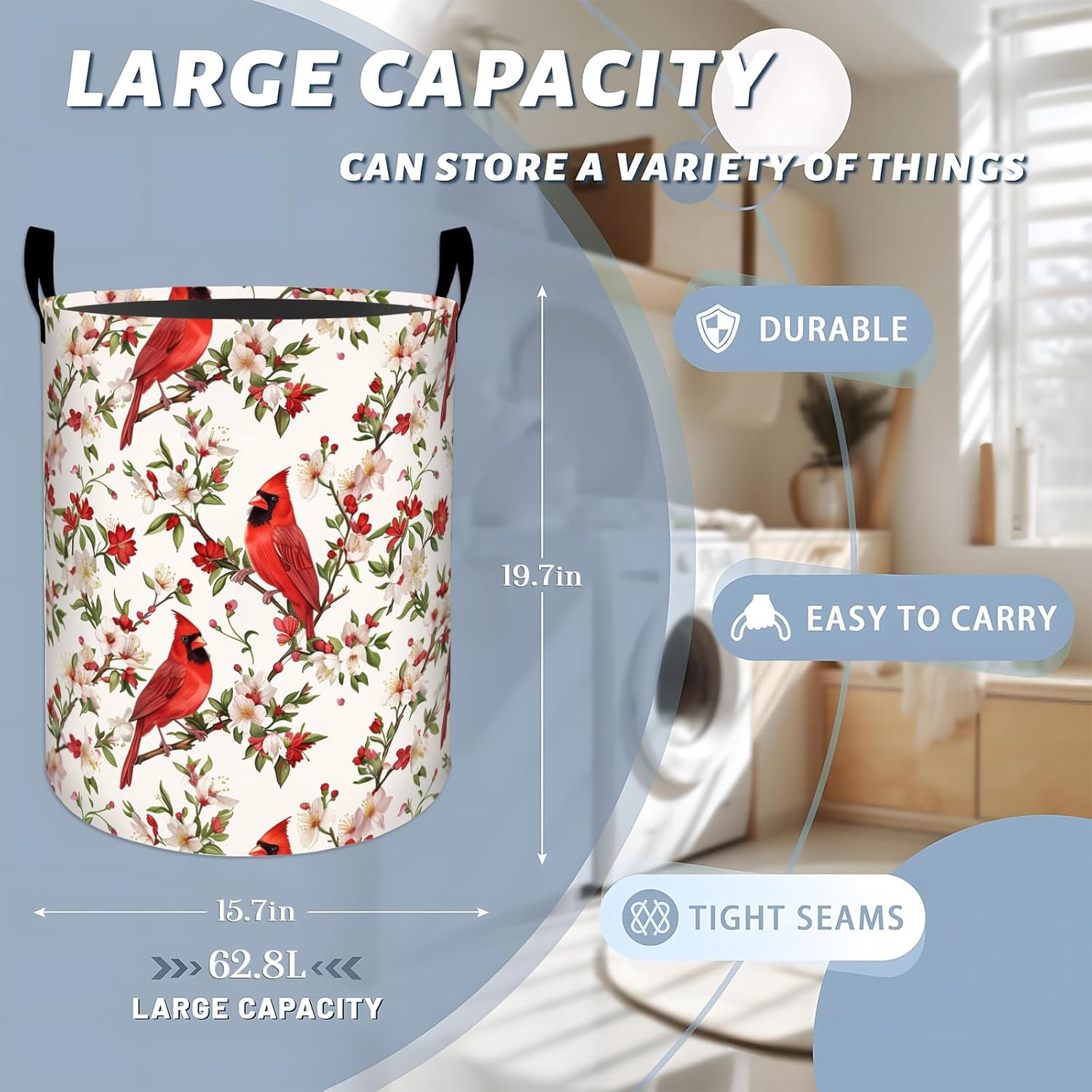 Keep your home organized with this large capacity laundry basket with handles, designed for convenience and durability. Made of thickened fabric with reinforced stitching, it resists tearing and ensures long-lasting use. The top opening features a PE support strip that keeps the basket upright and prevents collapsing, even when empty, making loading and unloading clothes much easier.With its spacious capacity, this hamper holds multiple loads of laundry, towels, or bedding, perfect for families, couples, or single users. When not in use, it folds flat for compact storage in closets, under beds, or tight spaces, making it ideal for apartments, dorms, or small homes.Equipped with reinforced fabric handles, the basket provides comfortable carrying between rooms, up and down stairs, or to laundromats.More than a laundry bin, this versatile basket doubles as a storage organizer for toys, blankets, pillows, seasonal clothing, or household essentials. Its simple, modern design blends seamlessly into bedrooms, nurseries, bathrooms, or living rooms.The fabric is easy to maintain, allowing quick cleaning with a damp cloth whenever needed. With its foldable design and practical structure, this hamper offers a convenient solution for everyday organization and travel.