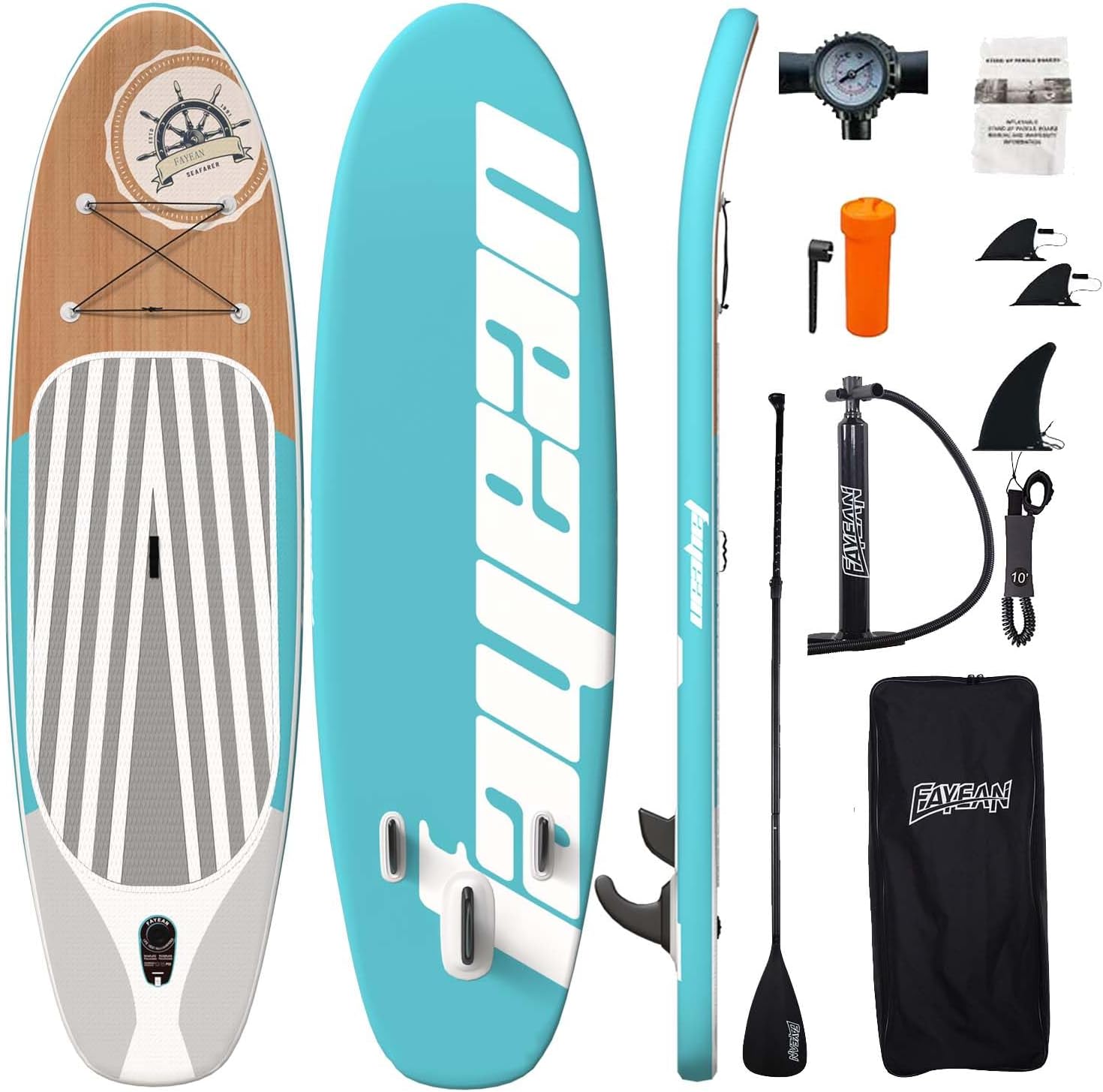 Our stand up paddle board is 33 inches wide, featuring 4 D-rings and a safety foot leash. The seams or valves are strictly tested, so that our inflatable paddle board won't leak easily, or bulge or spread slowly even after many times of use, which can meet your needs for long time surfing or fishing. We used premium PVC material to ensure ultimate comfort and durability for our inflatable sup. With internal high pressure structure designed for a maximum load of up to 400lbs, perfect for 2 adults or 1 adult + 1 child + 1 pet , which can meet your diverse needs. Our sup boards are stable paddle boards for first-time users and enables quickly inflates or deflates for easy storage, suitable for various water activities like cruising, yoga, surfing, fishing, sunbathing and more. Our paddle boards are able hold up multiple people and it will not be easily scratched by reefs or hooks. The portable paddle board can be quickly inflated in just 10 minutes without professional skills, so your child will never have to wait again. Folds up to the size of luggage and easily tucks into the boot!