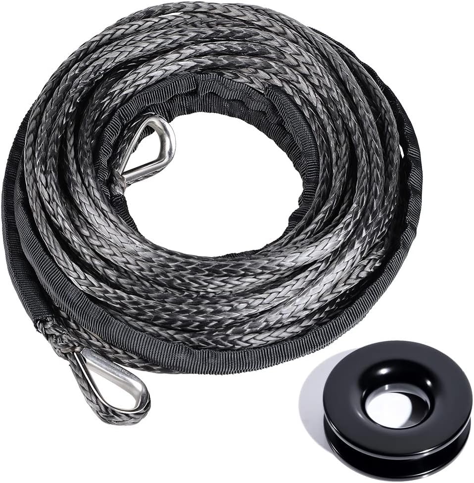 Overview: UHMWPE WINCH ROPE EXTENSION - Made of UHMWPE for Soft and Better Bending safer and stronger than steel wire rope. STAINLESS STEEL THIMBLE - Come with Stainless Steel Eyes (Thimbles) on both ends, stronger than traditional Soft Eyes. STRONGER WINCH ROPE EXTENSION - Each Wire Rope Extension has 7,500lb. Max breaking strengths that far exceed the traditional steel one. Each production run is strength tested to ensure that the highest quality standards are possible. 39" POLYESTER ROCK GUARD - Included 39-inch rock guard (both ends) to protect the rope from excessive heat. Condition: 100% Brand New Fitment: Compatible with SUV / ATV / UTV / Snowplow. Connection: Winch Rope + Hook + Hook + Extension. And the Rope must be 3/16 inch winch rope or 1/4 inch in thickness. PACKAGE CONTENTS: 1PC Synthetic Winch Rope Extension 2PCs Half-Linked Winch Hook SPECIFICATION: **ROPE EXTENSION: Size: Length: 50' -- Thickness:1/4" Breaking Strength: Max. 7500 lbs Color: Red Material: Synthetic Fiber Weight: 400g / 0.88lbs **WINCH HOOK: Working Load Limit (WLL): Max. 17,000lbs Color: Red Material: Heavy Duty Forged Steel Weight: 480g / 1.06lbs / 16.93oz each Hook NOTE: Actual color may be little different due to photographic equipment & monitor setting Please Read All Description and Fitment Before Ordering the Product. Please have professionals install the items to avoid trouble which very often caused by an inexperienced installer.