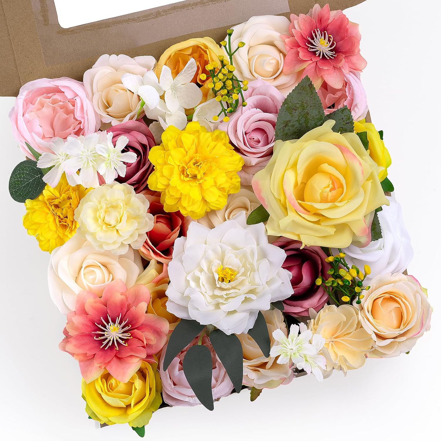 | Included Components | Artificial Carnations, Artificial Dahlias, Artificial Roses, Hot melt accessories, Plastic stems, Raffia |