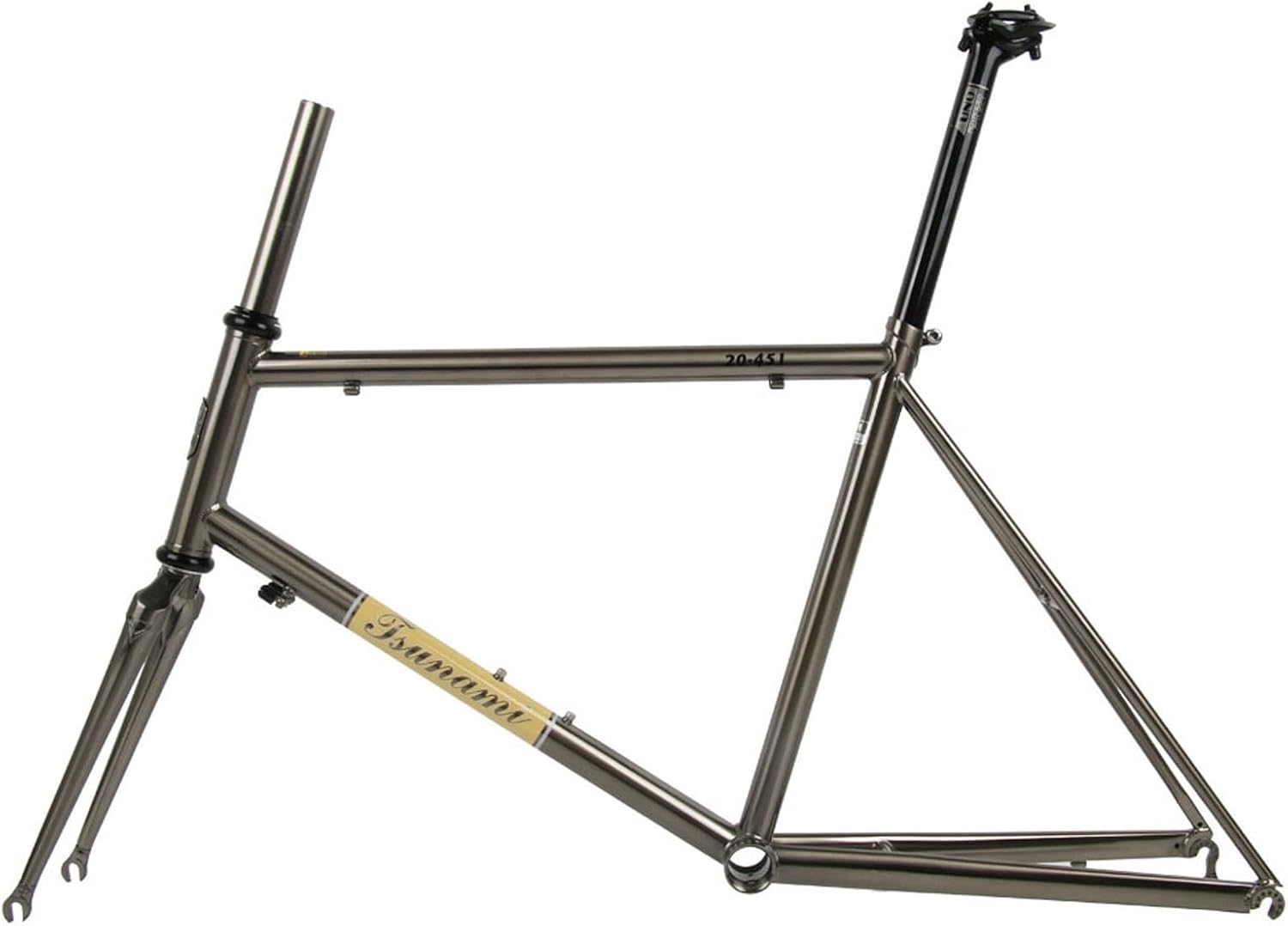 Road bike frameset, 42cm/44cm Chrome-molybdenum steel frameset C/Rim brake frame, Quick Release frame F100mm R130mm QR, Perfect gift for bike lovers, can be assembled with your friends.Product Name: Cr-mo Steel Bike FrameMaterial:Chrome-molybdenum steelFrame Size :42cm/44cmWheel Size: 451wheelsMAX Tire: 25CHeadset:34*34mm external headsetSeatpost: 27.2mmHead tube: 28.6mm 1-1/8''seatpost clamp: 30.2mmBottom Bracket: BB68mm threaded bottom bracketQuick Release: F100mm R130mm QRBrake type: C/Rim brakeColor: Rose Gold , Brushed Silver , Gray Package:Frame + fork + headset +seatpost clamp + seatpostNote:1. Please double check the size details in our list according to your actual situation to make sure you buy the right Bikes frame.2. Please allow slight dimensional tolerances due to manual measurements, lighting in photography may cause color differences from real life.3. If you have any product and service questions, please contact us and we will respond to you within 24 hours.