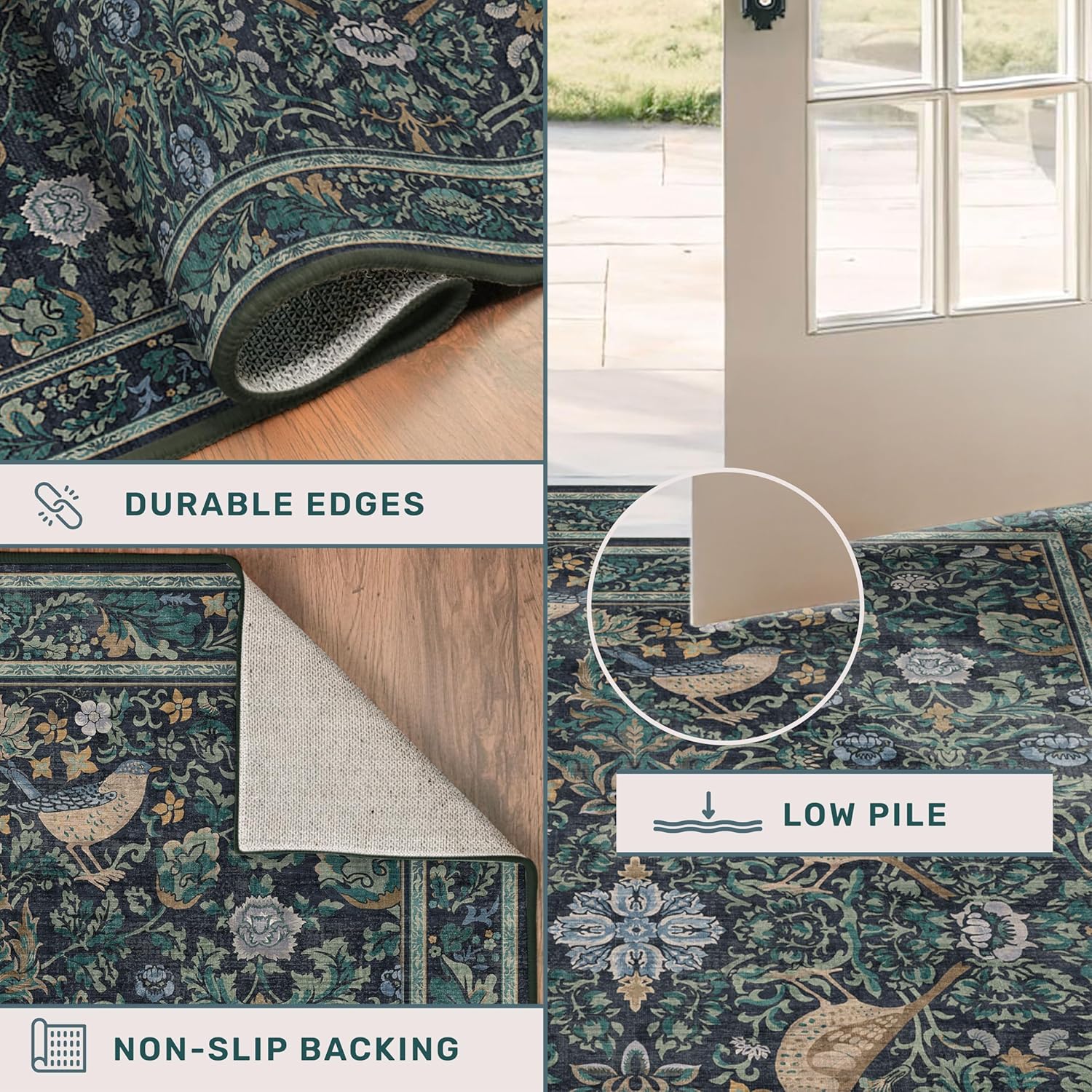 While adding a modern vintage appeal to your home.* Versatile Design: Perfect for a variety of spaces, including bathrooms, entryways, hallways, kitchens, laundry rooms, office chair mats, nurseries, dining rooms, bedrooms, and living rooms.* Durable Construction: Made with high-quality materials to withstand daily wear and tear.* Easy Care: Washable and stain-resistant for hassle-free maintenance. * Non-Slip Backing: Provides a secure grip on your floors, preventing accidents. * Low Pile: Ideal for easy vacuuming and cleaning.* Available in Multiple Sizes and Colors: Choose the perfect size and color to match your decor.Available Sizes:2x3 ft2x4 ft2x6 ft2'6"x8' ft2x10 ft3x5 ft4x6 ft5x7 ft8x10 ft9x12 ftAvailable Colors:Brown DarkSage GreenBeigeAdd a timeless piece to your home with this unique floral area rug, blending classic art and modern functionality.