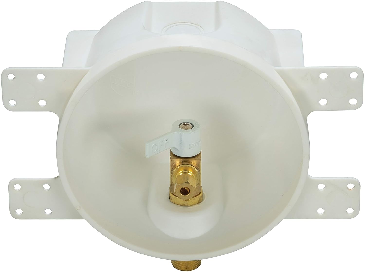 Featuring a round faceplate, the Water-Tite Round Ice Maker Outlet Box is specially designed to never look uneven. This outlet box includes one pre-installed lead-free quarter-turn brass valve, which complies with NSF 61-G requirements. Additional top knockouts are molded into the box to allow for mounting shut-off valves or gas valves. This outlet box is constructed with flat-sided walls to ensure a rigid mount against the stud bay and has four integrated flanges to facilitate easy and secure installation. It comes with an 8-inch-diameter faceplate as well as a protective cover that shields the valve from paint and debris during construction. Dimensions: 8 Inch Frame Width, 8 Inch Frame Height, 5.875 Inch Frame Opening Width, 5.875 Inch Frame Opening Height, 6 Inch Rough-in Box Width, 3.5 Inch Rough-in Box Depth, 6 Inch Rough-in Box Height, Supply Connection Size: 1/2 Inch, Supply Connection Type: Sweat
