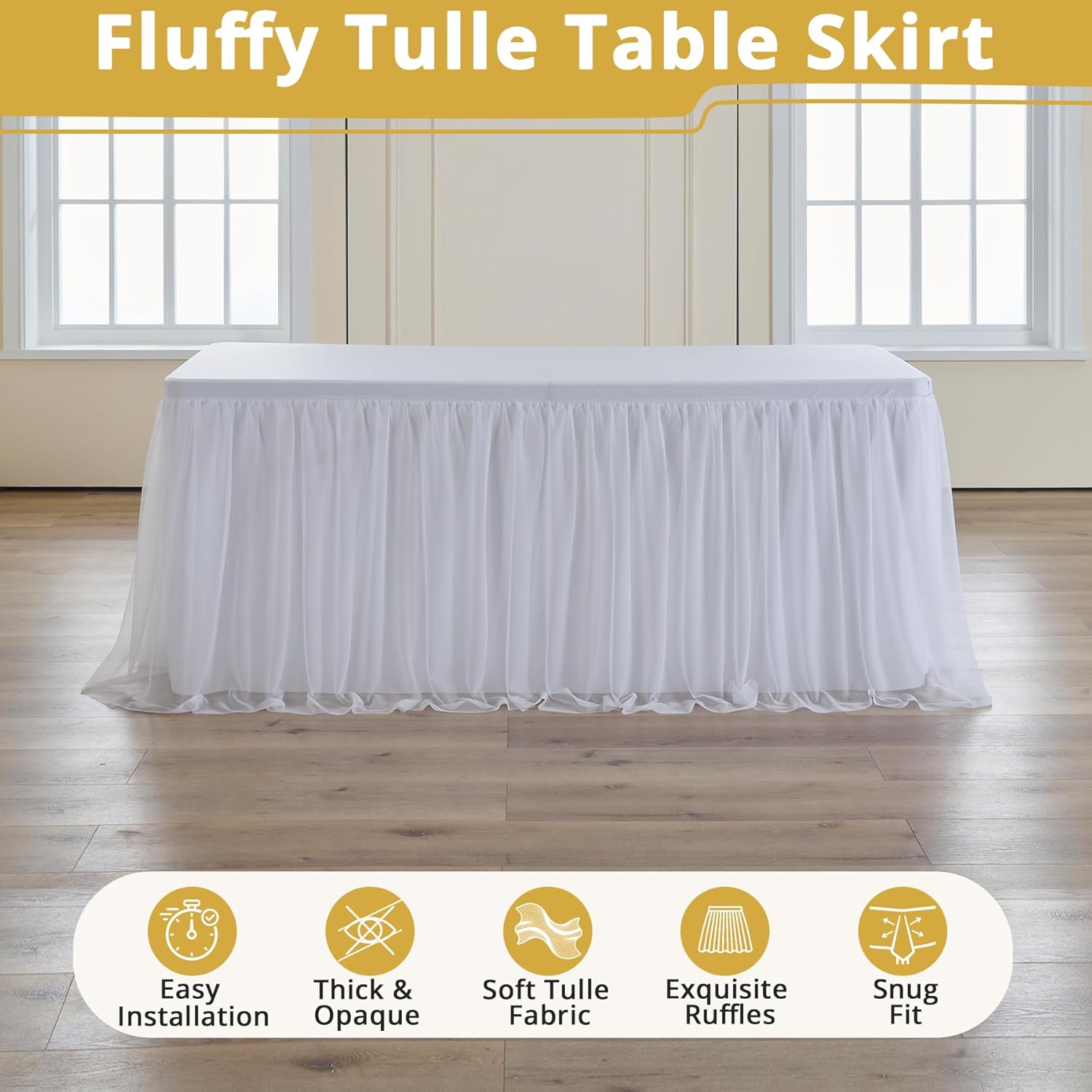 | Additional Features | Rectangle Tables, Spandex Table Cover, Tutu Skirt, White Tulle Tablecloth, Wrinkle Free Tablecloth |